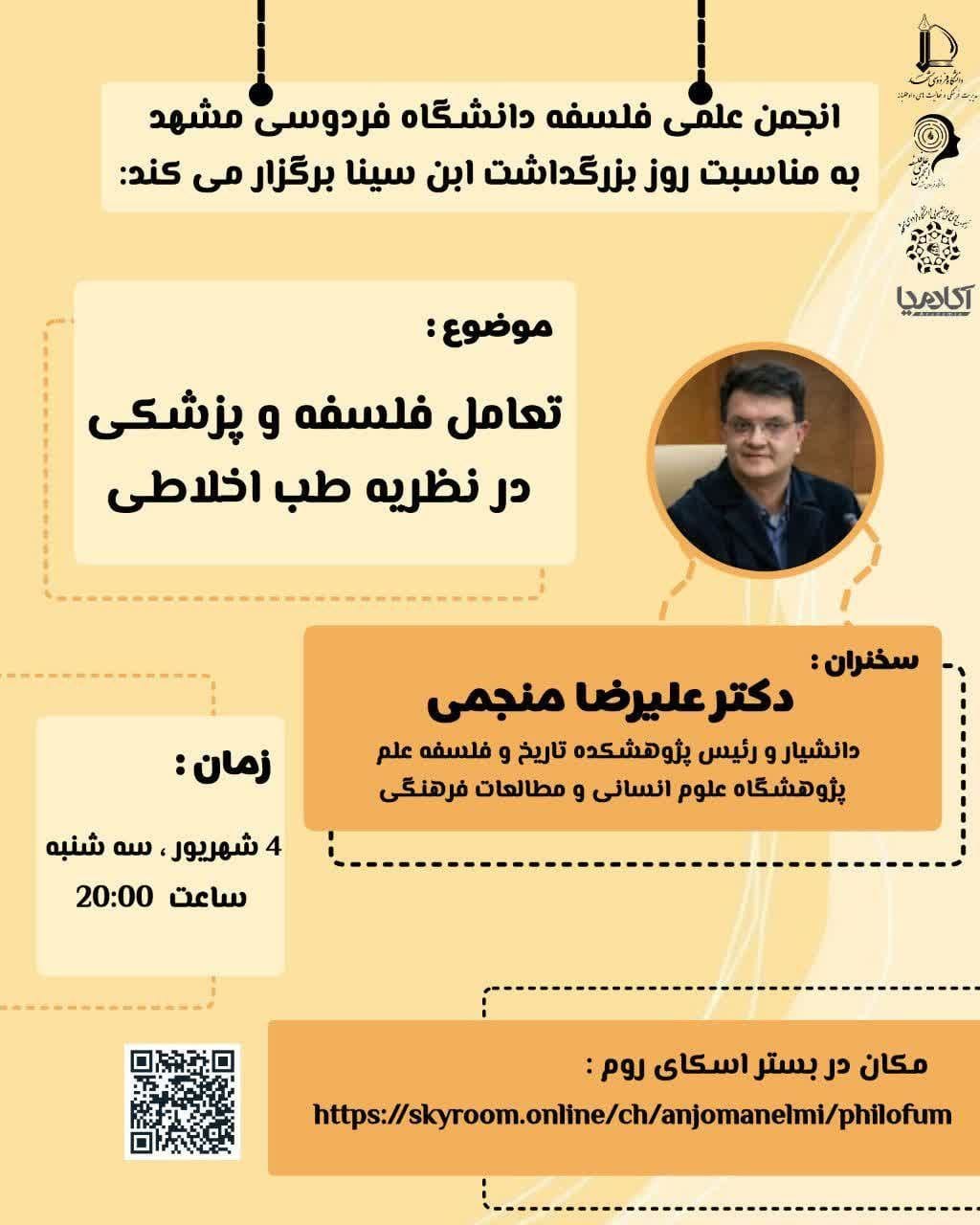 تعامل فلسفه و پزشکی در نظریۀ طب اخلاطی اخبارنشست ها بوسیله تحریریه در شهریور ۱۰, ۱۴۰۴ 0 به اشتراک گذاری به دعوت انجمن علمی فلسفه دانشگاه فرودسی مشهد و به مناسبت روز پزشک و بزرگداشت ابن سینا دکتر علیرضا منجمی به ایراد سخن با عنوان تعامل فلسفه و پزشکی در نظریۀ طب اخلاطی پرداخت. حلقه فلسفه پزشکیعلیرضا منجمی 0 به اشتراک گذاری