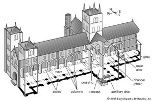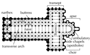در قلب زندگی مسیحی تجسد خدا و خدایی شدن انسان وجود دارد. نقش نهایی معماری کلیسا بازتاب این حقیقت و کمک به واقعیت بخشیدن به خدایی شدن انسان است که طراحی و ساختار آن هم در آسمان و هم در زمین ریشه دارد یعنی هم در اصول بی زمان الهی و هم در ویژگی های زمان و مکان زمینی. بدین گونه می توان از سه نوع طراحی کلیسا نام برد: مرکز گرا (طراحی هشت ضلعی ، مربع یا دایره ای) ، مستطیلی، صلیب وار. کلیساهای کاتولیک اروپایی بصورت مستطیلی بنا شده بر یک صلیب طراحی می شوند. معمولا بر روی اضلاع این صلیب اتاق ها و سرسراهایی به شکل مکعب مستطیل و با ارتفاع بلند بنا شده است.