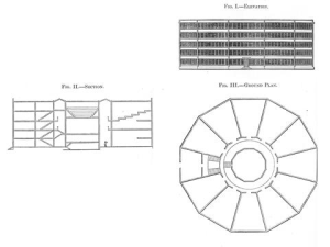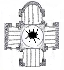 همانطور که دیدیم مشکل ساموئل بنتام مراقبت و نظارت بر کارگران در حین کار و تعلیم بود. او متاثر از معماری کلیساهای ارتدکس راه حل این مشکل را در شیوه طراحی معماری ساختمان یافت و در سال ۱۷۸۶ طرح مشهورش درباره «مشاهده مرکزی»[۱] را ارائه کرد. در شکل ۴ اگر بازوهای صلیب را امتداد دهیم و گنبد- محل نظارت مسیح- را پایین بیاوریم و بصورت جایگاه مشاهده گر طراحی کنیم آنگاه ناظر مستقر در این جایگاه می تواند بر تمام افرادی را که در بازوها در حال کار هستند نظارت داشته باشد.
