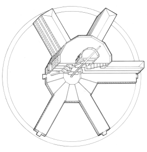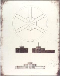 همانطور که ملاحظه می شود در نقشه فوق یک استوانه دوازده وجهی در مرکز قرار دارد که تقریبا دارای قطر ۲۸ متر است که پنج بازو به طول ۲۱ متر و عرض ۵/۶ متر به آن متصل هستند.به جای بازوی ششم ، ایوان و ورودی اصلی ساختمان قرار دارد. استوانه دارای سه حلقه هم مرکز است. قطر حلقه مرکزی ۵/۵ متر می باشد که شش طبقه در آن بنا شده است. زیر طبقه همکف تجهیزات گرمایی و منبع آب می باشد. طبقه همکف شامل اتاقی اداری برای کارمندان مدرسه هست. طبقه همکف “اتاق نظارت مدیر” است. “نظارت های موضعی” از دو طبقه بالای آن نیز امکان پذیر است. دو طبقه بالایی ساختمان بهداری مدرسه می باشد که از سایر بخش ها مجزا هست. اطراف این اتاق ها فضای حلقوی خالی است که دو متر پهنا دارد و گالری ها و راه پله های چلیپایی دورادور آن قرار دارند. سومین و خارجی ترین حلقه ۹ متر پهنا دارد و به دوازده بخش تقسیم شده است که پنج بخش آن متصل به بازوهای منشعب از ساختمان هستند. هر بازو دارای چهار طبقه است که توسط اتاق های نظارت حلقه اول مراقبت می شوند.