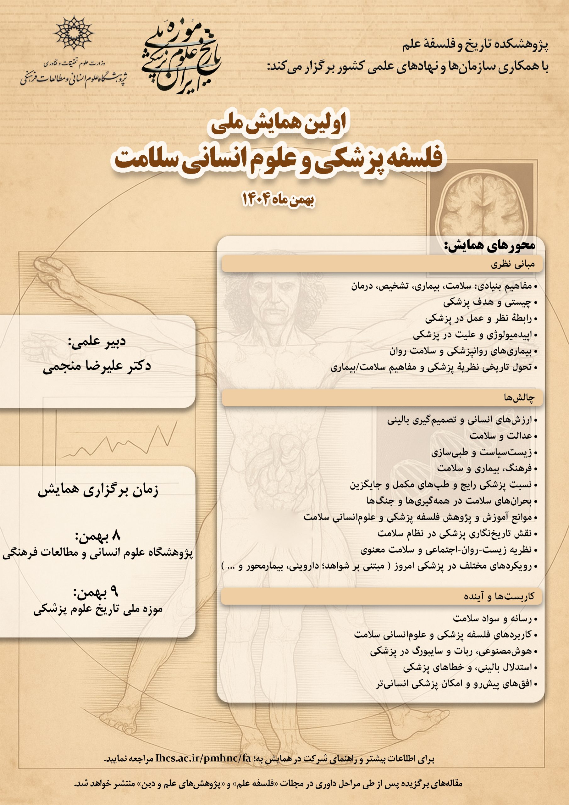 همایش ملی فلسفه پزشکی با تمرکز بر این وضعیت، میکوشد بستری مشترک برای تعامل میان حوزههای پراکنده علوم انسانی سلامت فراهم کند و با گردهمآوردن پژوهشگران وابسته به وزارت بهداشت و وزارت علوم، امکان گفتوگویی میانرشتهای را فراهم آورد که از رهگذر آن، همافزایی علمی و فهمی جامعتر، تاریخیتر و انسانیتر از مسائل سلامت در کشور شکل گیرد.